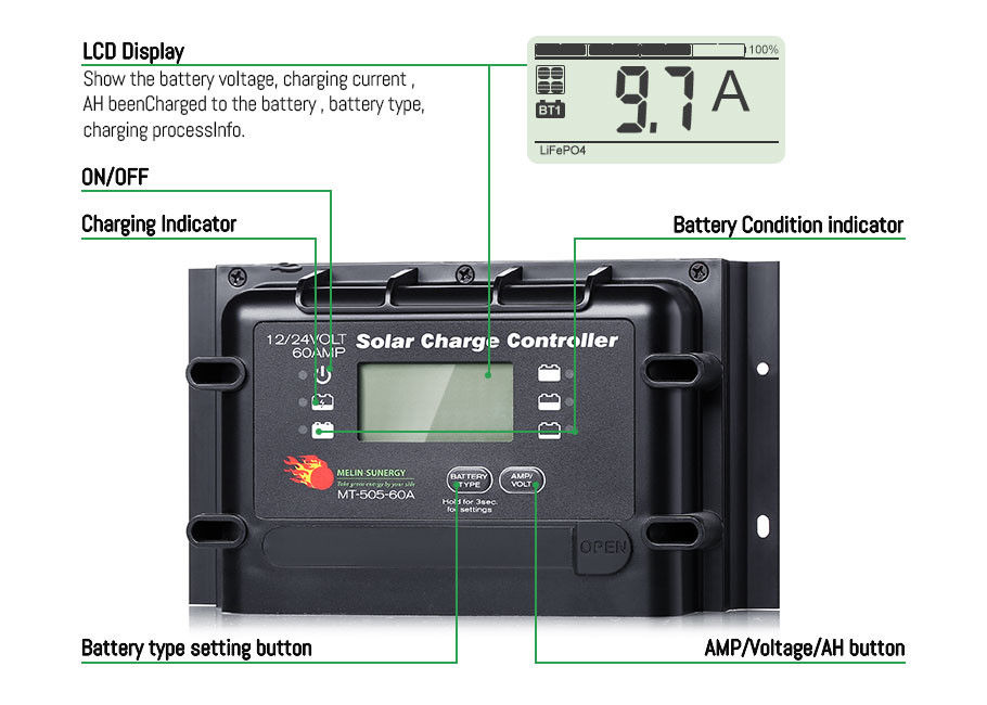 | Potencia Solar Máx. de Entrada | 1140W@sistema de 12V, 2280W @24V |